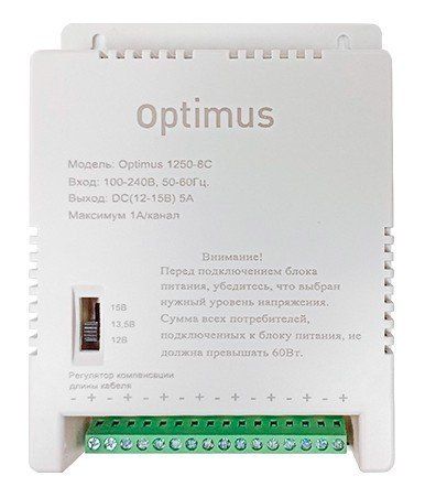 Источник питания стабилизированный; U-вх.100…240 В, U-вых.12…15 В (регулировка), I-ном.5 А (8 выходов х 1 А), U-пульс.150 мВ; защита от перегрузок по току и короткого замыкания, винтовые клеммники; IP54, t-раб.-20…+45°С, 144×110×33 мм. Пластиковый корпус.