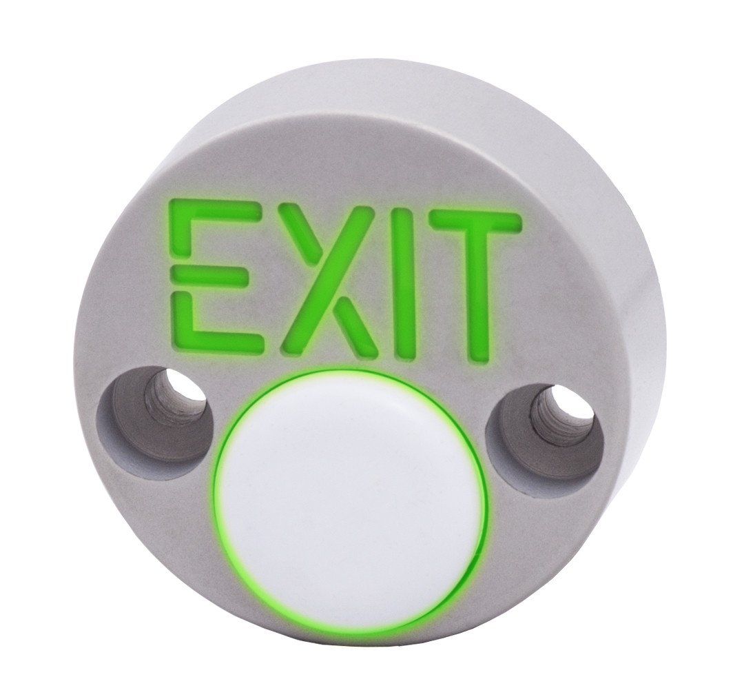Кнопка накладная, контакты нормально разомкнутые (НР), материал: анодированный алюминиевый сплав. Светодиодная подсветка контура кнопки и надписи "EXIT" зеленого цвета, U-подсв. 12 В, U-комм. 36 В, I-комм. 2 А, габ.размеры Ø39x17 мм.