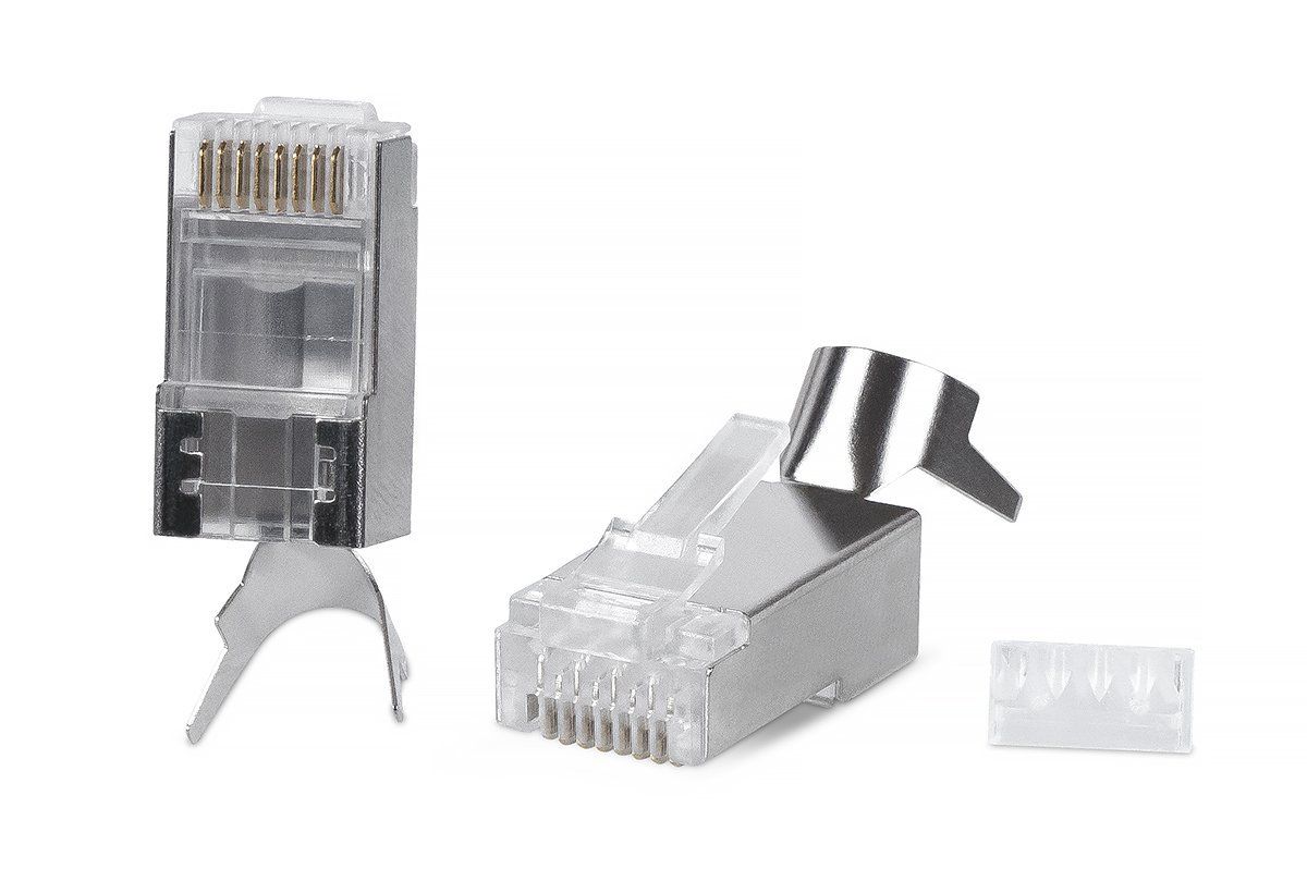 Разъем RJ-45(8P8C) под витую пару, кат. 6, экранированный, универсальный (для одножильного и многожильного кабеля), диаметр проводников: 23-24 AWG (0,64-0,57 мм), со вставкой, для толстых жил 1.35мм(с оболочкой)