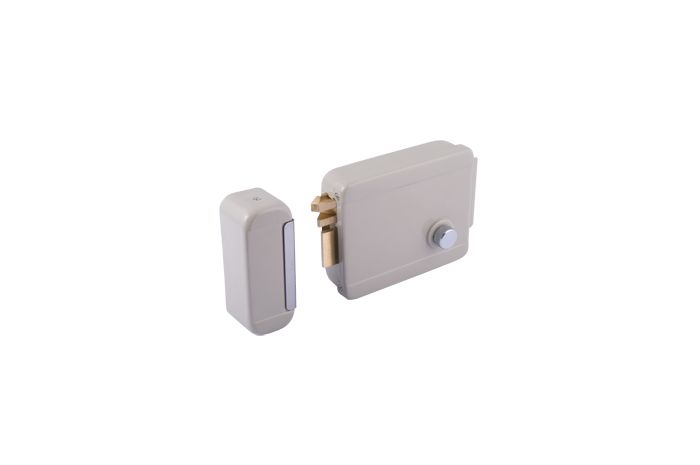 Электромеханический накладной замок, ключ снаружи, кнопка изнутри, для дверей всех типов, DC 12В, 3А, материал - нержавеющая сталь (порошковая окраска), от -40° до 50°С, 148х107х55 мм.