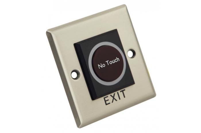 ИК-кнопка выхода из нержавеющей стали с индикацией, бесконтактное срабатывание до 10 см, тип контактов НО/НЗ, 3А/36В (DC), 86×86×29 мм.