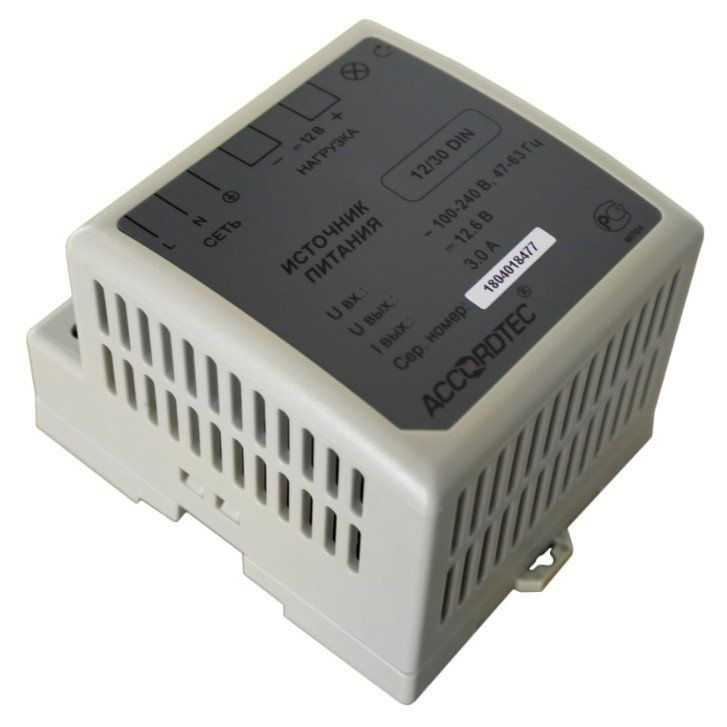 Источник вторичного питания стабилизированный, U-вх. ̴110…240 В, U-вых. =11,5…14 В ±5% В (регулируется), I-ном. 3 А, I-макс. 3.5 А, защита от КЗ и перегрузки, IP67, t-раб. +10…+40°C, габ.размеры 94х78х67 мм, пласт.корпус на DIN-рейку
