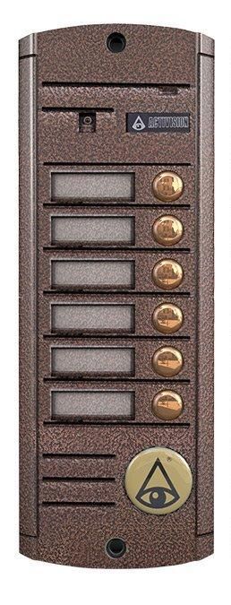 Вызывная видеопанель на 6 абонентов, накладная, 4-х проводная, 1000 ТВЛ, ИК-подсветка, питание 12 В, -50…+50°C, IP55, 185х70х20 мм, цвет медь