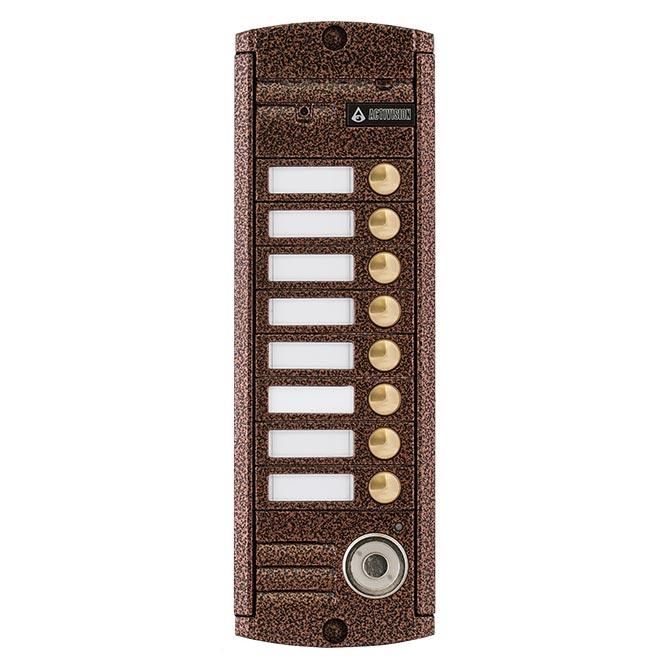 Вызывная видеопанель на 8 абонентов со встроенным считывателем Touch Memory, накладная, 4-х проводная, 1000 ТВЛ, ИК-подсветка, память на 1005 ключей, питание 12 В, -50…+50°C, IP55, 215х70х20 мм, цвет медь