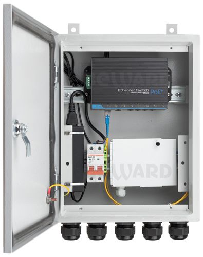 Коммутатор сетевой 6 портовый с РоЕ уличный; 4хRJ45 PoE 10/100 Мбит/с, IEEE 802.3af/at, 1хRJ45 Uplink 10/100 Мбит/с, 1хSFP 1000 Мбит/с; PoE бюджет до 60 Вт; дальность передачи до 250 метров; встроенный оптический кросс, AC 220В, 113Вт; IP54; -40... +50°C; 400х310х120 мм