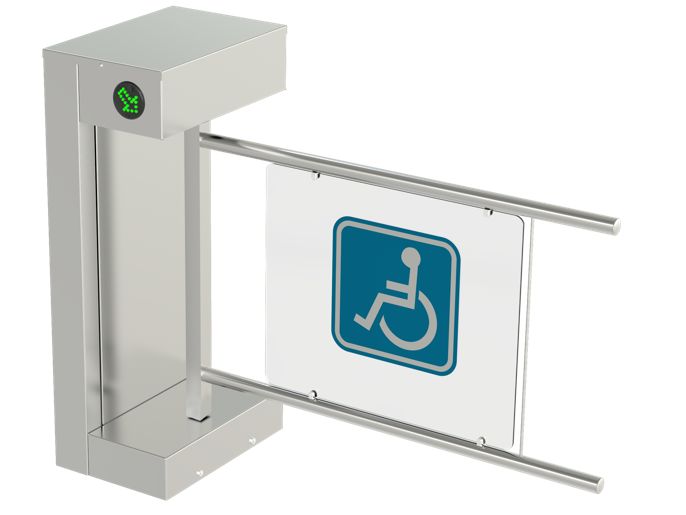 Турникет-калитка МГН моторизованная SALOON 705. Корпус - нержавеющая сталь. Светодиодные указатели прохода и направления. Сервопозиционный электропривод створки с определением препятствий и автоматической разблокировкой при отключении электроэнергии. Створка 900 мм с информационной вставкой. Время открытия 2.2 сек. Встроенный блок питания. IP54.