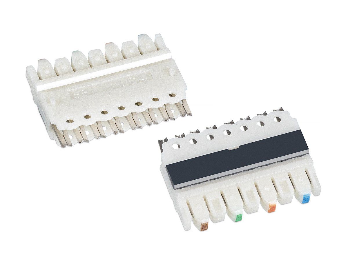 Модули устанавливаются одной стороной на 110 блок после разводки на них отдельных пар кабеля, а вторая сторона модуля выполняет роль розеточной части разъема типа 110 и предназначена для подключения коммутационных шнуров и кроссировочных проводов.