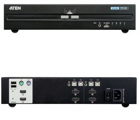 Переключатель KVM защищенный, KVM+Audio+USB 2.0, 1 консоль PS2/USB+2xHDMI => 2 cpu USB+2xHDMI, без шнуров, 3840x2160 30Гц, настол., исп.стандарт.шнуры, без OSD, некаскад., АС 100-240 В, 1А, 0…+50°C, 335х164х65 мм.