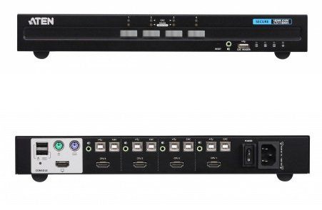 Переключатель KVM защищенный, KVM+Audio+USB 2.0, 1 консоль PS2/USB+HDMI => 4 cpu USB+HDMI, без шнуров, 3840x2160 30Гц, настол., исп.стандарт.шнуры, без OSD, некаскад., АС 100-240 В, 1А, 0…+50°C, 335х164х44 мм.