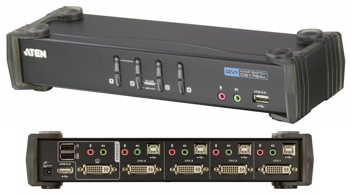 CS1764A-AT-G – KVM Переключатель ATEN CS1764A CubiQ™ является представителем нового поколения KVM-переключателей (клавиатура, видео и мышь), объединяя в себе 4-портовый KVM-переключатель и 2-портовый USB 2.0-концентратор, и обеспечивая возможность подключения цифрового монитора (DVI). Кроме того, CS1764A поддерживает новую технологию ATEN – Video DynaSync™, оптимизирующую разрешение экрана, а также определяет состояние питания, т.е. если один из компьютеров выключается, CS1764A автоматически переключается на следующий включенный компьютер.