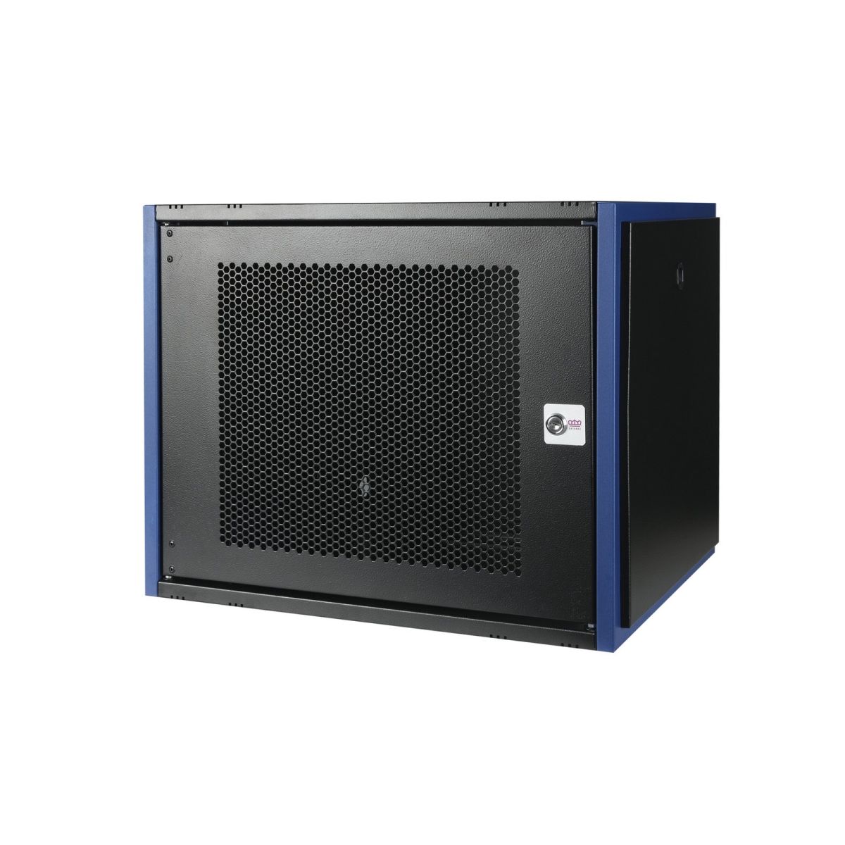 Шкаф телекоммуникационный 19" настенный, 9U, передняя дверь перфорированная, перфорация составляет 70%, задняя стенка сплошная цельнометаллическая, 461х600х450 мм (ВхШхГ), полезная глубина 434мм, распределенная нагрузка: 50 кг, в комплект поставки входит: комплект крепежа для сборки; щеточный кабельный ввод, черный RAL 9005, IP20.