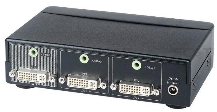 Коммутатор DVI + стерео сигнала, 2 вход / 1 выход, HDCP, разрешение HDMI до 1080р; управление при помощи кнопок на лицевой панели, /ИК-пульта; DC 5В/1000мА (БП в комплекте); -40...+55°C; 145х37х96мм.
