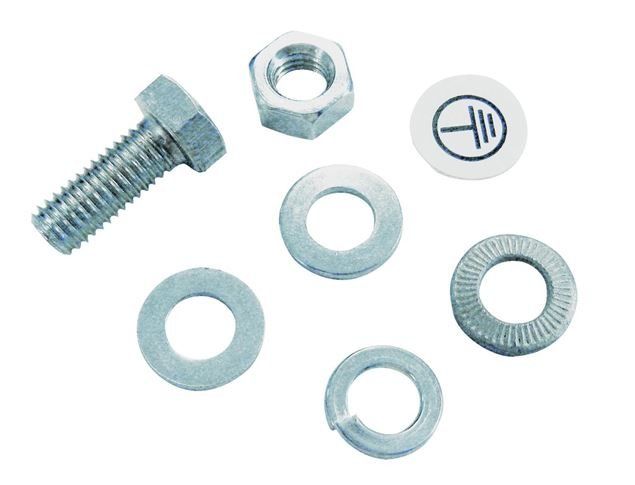 Комплект заземления М6. Комплектность: болт, 2 шайбы, контактная шайба, пружинная шайба и знак заземления.