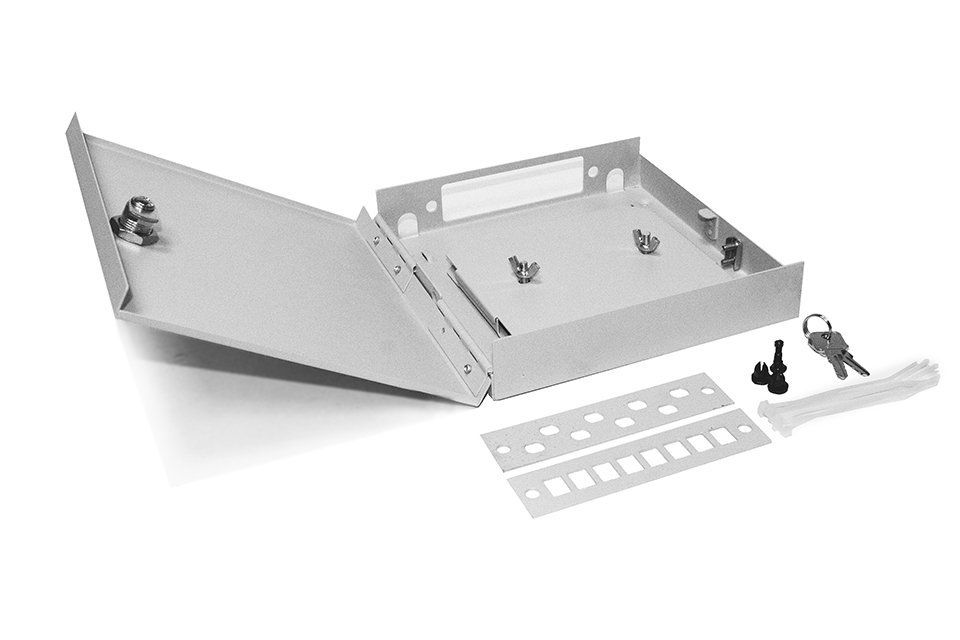 Бокс оптический универсальный, настенный на 8 портов (SC, duplex LC, ST, FC) с держателем для 8 КДЗС, фиксатором центрального силового элемента, зажимом для организации кабеля, Рулон-липучками (без пигтейлов и проходных адаптеров)