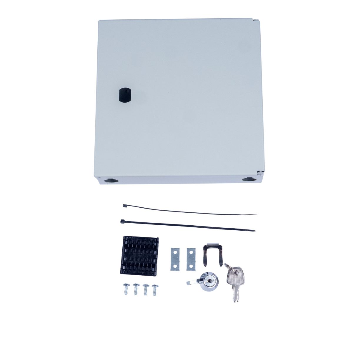 Кросс оптический настенный, до 8 ST/FC портов, стальной, серый, с ложементом, дверка с замком, сплошная панель внутренняя, 184х184х45 мм.