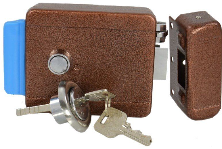 Замок накладной, электромеханический, универсальный (дверь наружу, внутрь), ролик взвода пружины, блокировка ключом кнопки выхода, цвет коричневый (медь), 12В, 142х105х35мм.