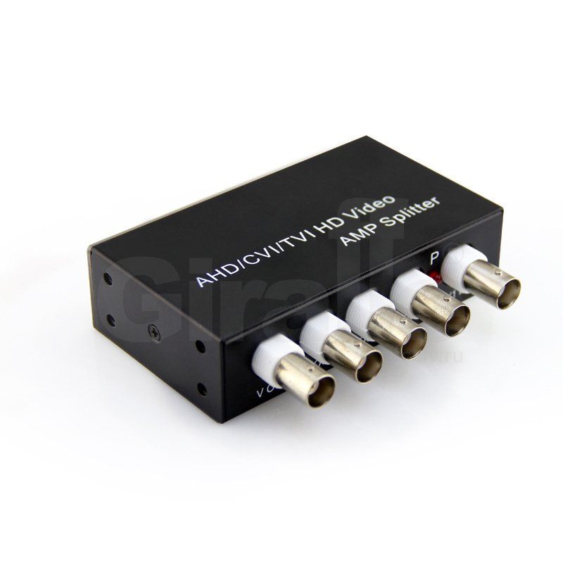 Разветвитель видеосигнала AHD/CVI/TVI/CVBS (1вх./4вых.) разрешение до 5 МП; 60 МГц ; DC12В/250мA ; 50 х 110 х 30мм; Грозозащита и защита от электростатического разряда CLASS 4