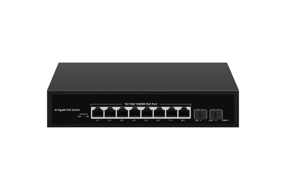 Коммутатор неуправляемый 10 портовый с PoE; 8xRJ-45 10/100/1000Мб/с портов (af/at) (7-8 порты до 250м); 2x SFP 1000Мб/с порта Uplink; бюджет PoE 120 Вт; VLAN режим; AC 100-240 В; 125 Вт; -10...+50°C; грозозащита до 4 кВ и защита от электростатического разряда до 8 кВ; 220х161х44мм.