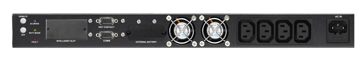 Источник бесперебойного питания On-Line, чистая синусоида; P-нагр.1000 ВА/800 Вт; U-вх.160…275 В, под 4 внешних АКБ 12 В; RS-232, USB; выход 4xIEC320 C13; защита от перезаряда, перенапряжения, короткого замыкания; t-раб.0…+50°C, 1U, 438х44х300 мм.