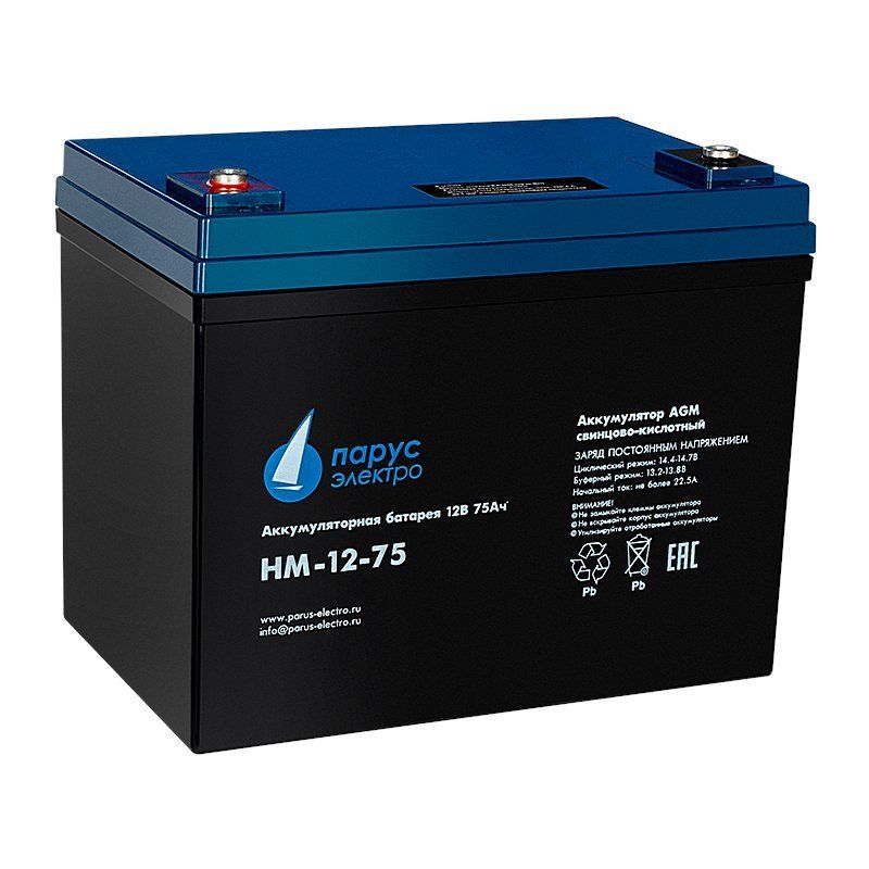 Свинцово-кислотный, герметичный аккумулятор, 12В/75Ач, M6 (клемма диаметром 14 мм под вертикальный болт), 258x166x206мм, 23.0 кг
