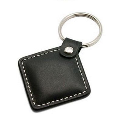 Брелок перезаписываемый (Temic) в кожаном корпусе, с кольцом, цвет черный.