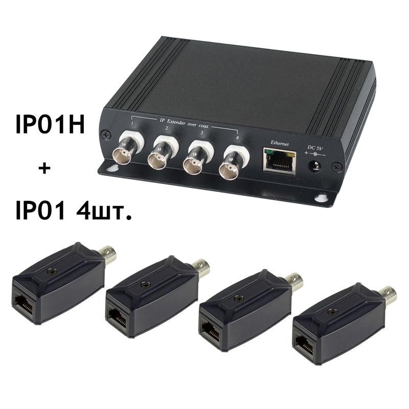 Комплект удлинителей Ethernet 4-канальный; 4 передатчика IP01, один приемник IP01H; передача Ethernet по 4 каналам в коаксиальном кабеле на расстояние 200 метров; -40 ...+45 С; 69х25х22 мм и 125х121х30 мм. БП в комплекте.