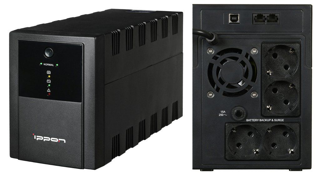 Источник бесперебойного питания, модифицированная синусоида; line-interactive; P-нагр.1500 ВA/900 Вт; U-вх.220 В; розетки с батарейной поддержкой Schuko: 4 шт; АКБ 12В/9Ач × 2 шт; 139х195х364 мм