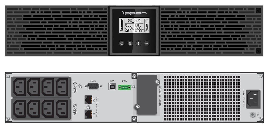 Источник бесперебойного питания line-interactive, чистая синусоида; P-нагр.2000 ВA/1800 Вт; U-вх.220 В, 4 АКБ 12 В 9 Ач; LCD-дисплей, USB, RS232; розетки с батарейной поддержкой IEC320 С13: 8 шт; 439х86,5х436 мм