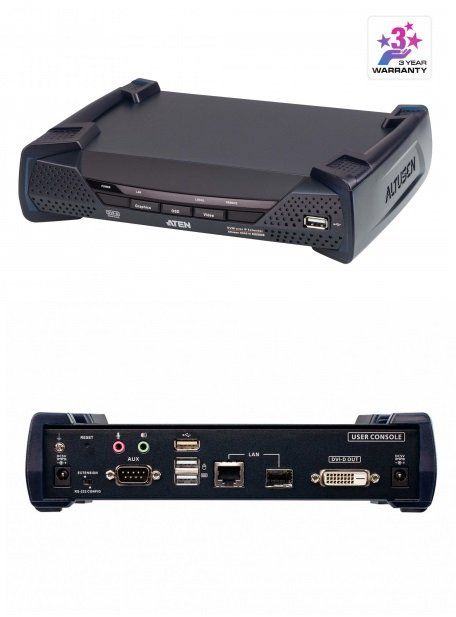 Удлинитель-приемник, KVM USB DVI-D+AUDIO+RS232, 100м UTP/10км SM точка-точка/неогранич. в пределах LAN, 1xUTP/2xоптич.волокна SFP(LC); GbE (TCP/IP; IGMP), DVI-D+4xUSB A-тип+2xMINI JACK+DB9, макс.разр. 2560х2048, БП в комплекте, DC 5В, 10Вт, 0…+50°C, 215х163х41 мм.