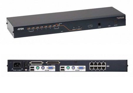 Переключатель Switch 19", VGA/SVGA+KBD+MOUSE, 2> 8 портов/port (PS2/USB/Sun+VGA)/RS232, без модулей, (спец.шнур-адаптер и UTP; DDC2B;каскад. до 256; HP AF616A), АС 100-240 В, 1А, 0…+50°C, 437х156х44мм.