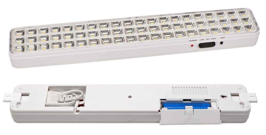 Светильник аварийного освещения светодиодный с выбором режима свечения: постоянный или непостоянный; 60 светодиодов, световой поток 200 Лм; U-пит.187...242В, 1 Li-ion аккумулятор 3.7 В, 2200 мАч, время свечения - до 3 часов; t-раб.0...+40°С, 340х55х30 мм, 0.25 кг