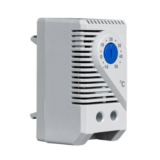 Термостат на DIN-рейку; нормально-разомкнутый контакт (NO) для регулирования вентиляторов с фильтром, теплообменников, приборов охлаждения или для включения сигнальных датчиков при превышении температуры, U-пит.220В; t-раб.-45...+60°C, 60x33x43 мм.