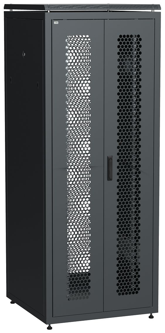 Шкаф телекоммуникационный 19" напольный, передняя дверь двустворчатая перфорированная, задняя дверь перфорированная, 42U, 2055х800х800 мм (ВхШхГ), полезная глубина 715 мм, ручка с замком, распределенная нагрузка: 1000 кг, цвет чёрный.