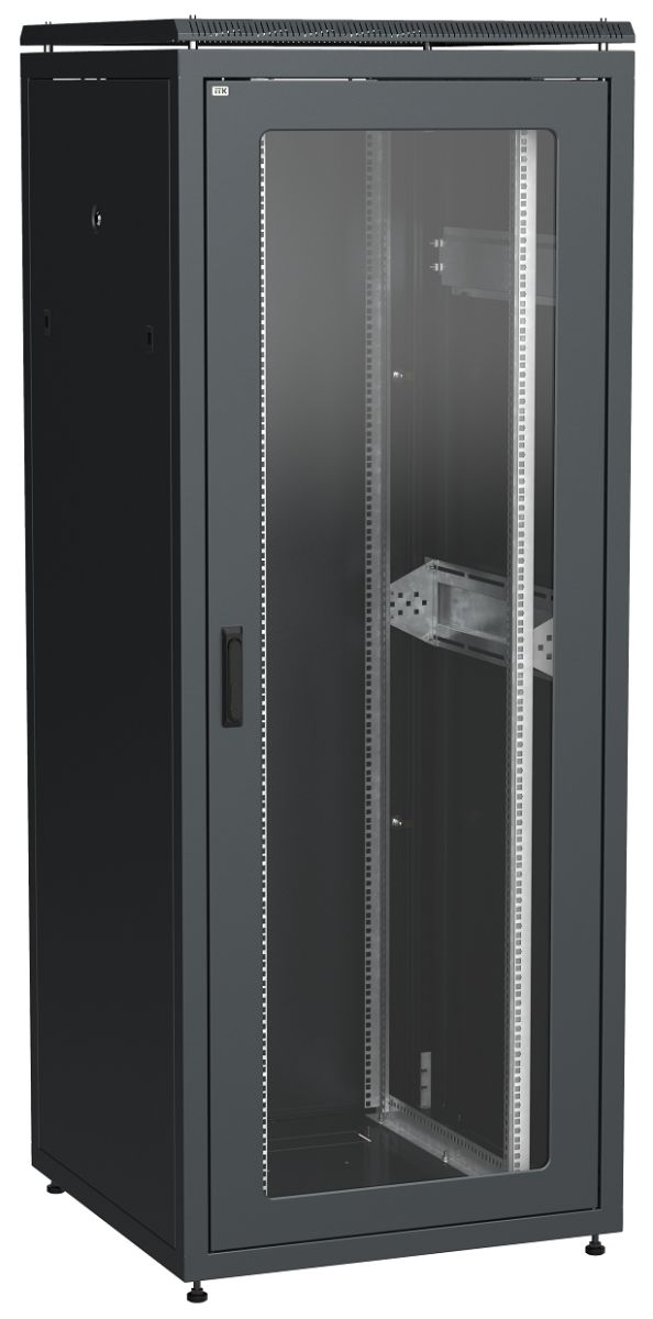 Шкаф телекоммуникационный 19" напольный, передняя дверь стекло, задняя дверь металл, 42U, 2055х800х800 мм (ВхШхГ), полезная глубина 715 мм, ручка с замком, распределенная нагрузка: 1000 кг, цвет чёрный.