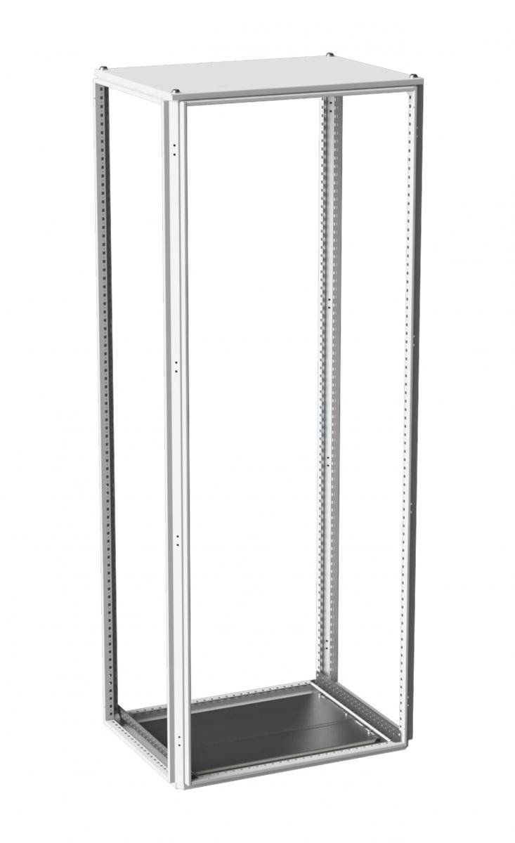 Цельносварная открытая со всех сторон рама MF, на которую навешиваются остальные узлы комплектации напольного шкафа. Профили рамы не замкнуты, изготовлены из листовой стали толщиной 2,0 мм. Углы рамы усилены стальными закладными элементами и сварены непрерывным циклом для придания жесткости. Выполнена перфорация на профилях под закладные гайки и под саморезы с шагом 25 мм.