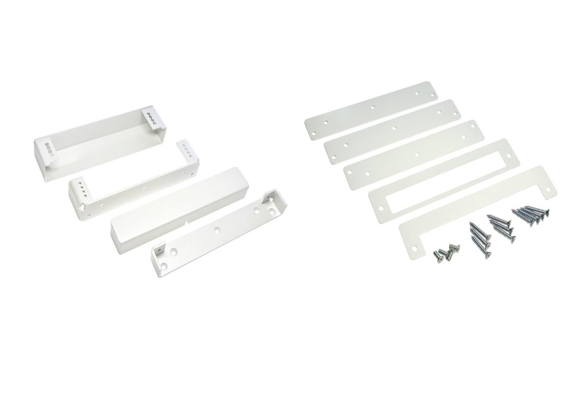 Монтажный комплект для установки замка ALM-700S в накладном варианте, с возможностью регулировки положения якоря относительно кронштейна корпуса замка от 0 до 23 мм. Цвет: белый.