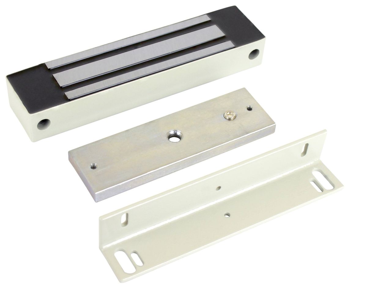 Электромагнитный влагозащищенный замок, усилие 300 кг, 12 В DC, 0,47 A, IP67, -40...+40 °С, 222x52x34 мм, уголок в комплекте. Механический компенсатор устранения остаточной намагниченности на якоре замка. Цвет - белый.