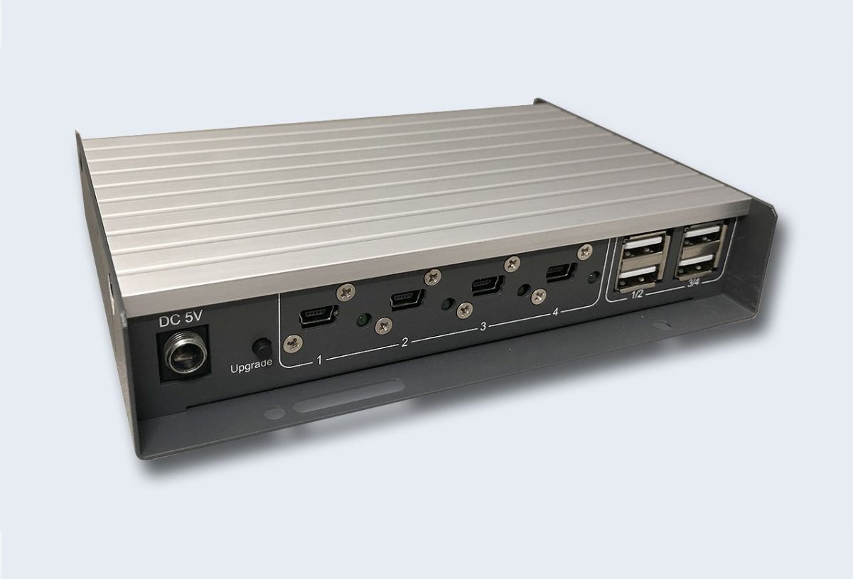 Переключатель, KBD+MOUSE/KM, 1> 4 блока/порта/port USB, позволяющий с одной консоли, оснащенной USB клавиатурой и мышью, управлять 4 рабочими станциями (серверами), cо шнурами USB 4х1.2 м., (конс.упр. - USB;каскад. до 4-х устройств, (функция "Free Flow", питание USB устройств - 4х500мA), DC 5В 2A, 0…+45°C, 155х110х30 мм.