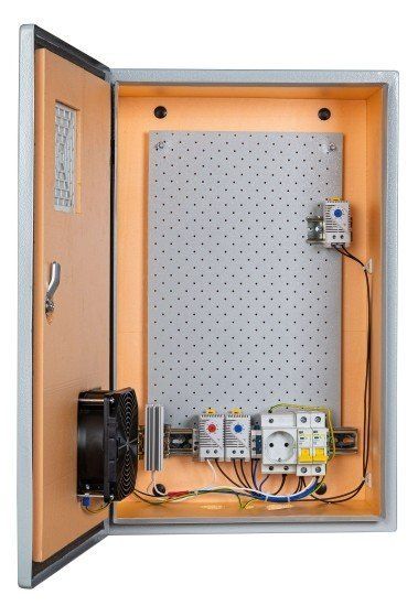 Климатический навесной шкаф с вентиляторными решетками, вентилятором (активная вентиляция) и защитным реле от "холодного пуска". Комплектация: утеплитель из пенополистирола, замок 1 шт., ключ 1 шт., монтажная плата 1шт., гермовводы 2 шт., розетка 1 шт., автомат.выключатель 1 шт., термореле 1 шт., реле предстарта 1 шт., нагреватель Р=50 Вт 1 шт, вентилятор NTL FF 152 1шт., вентиляционные панели 2 шт.; IP54, t-раб. -55...+50°С; внутр.размер (ШхВхГ) 320х520х130 мм, внеш.габариты (ШхВхГ) 360х560х196 мм; вес 8 кг, цвет ral 7035 (серый)