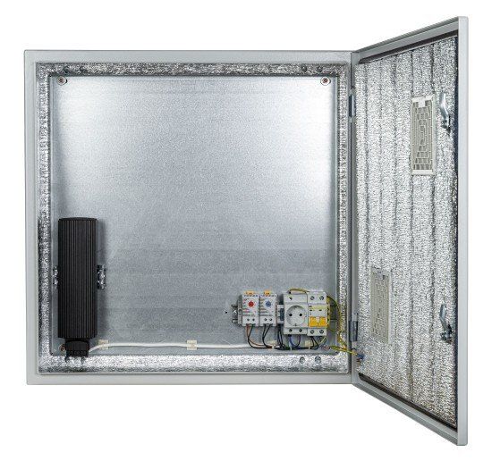 Климатический навесной шкаф с вентиляторными решетками (пассивная вентиляция) и защитным реле от "холодного пуска". Комплектация: утеплитель из порилекса НПЭ, замок 2 шт., ключ 1 шт., монтажная плата 1шт., люк под гермовводы 1 шт., гермовводы 5 шт., розетка 1 шт., автомат.выключатель 1 шт., термореле 1 шт., реле предстарта 1 шт., нагреватель Р=150 Вт 1 шт, вентиляционные панели 2 шт.; IP54, t-раб. -55...+50°С; внутр.размер (ШхВхГ) 577х577х180 мм, внеш.габариты (ШхВхГ) 600х600х210 мм; вес 23 кг, цвет ral 7035 (серый)