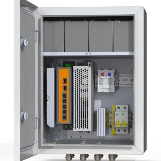 Коммутационный термошкаф: промышленный управляемый коммутатор 4хRJ45 10/100/1000 Мб/с PoE 802.3 af/at watchdog, 2хSFP 1000 Мб/с бюджет PoE 140 Вт, блок питания 155Вт/48-58 В, обогреватель 50Вт, сдвоенный термостат, оптический кросс 4 порта SC, гермовводы 4хPG9, 4хPG13.5, автомат 6А, цвет серый, АКБ 12В 7Ач 4 шт, 230 В AC, 210Вт, устройство грозозащиты линии 220В и линий PoE, IP66, -60°С... +50°С, 300х400х210 мм.