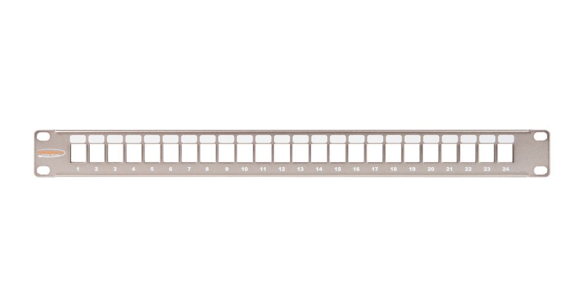 Патч-панель наборная экранированная 19"; 1U; 24 портов Keystone(не шире 17-ти мм), цвет металлик.