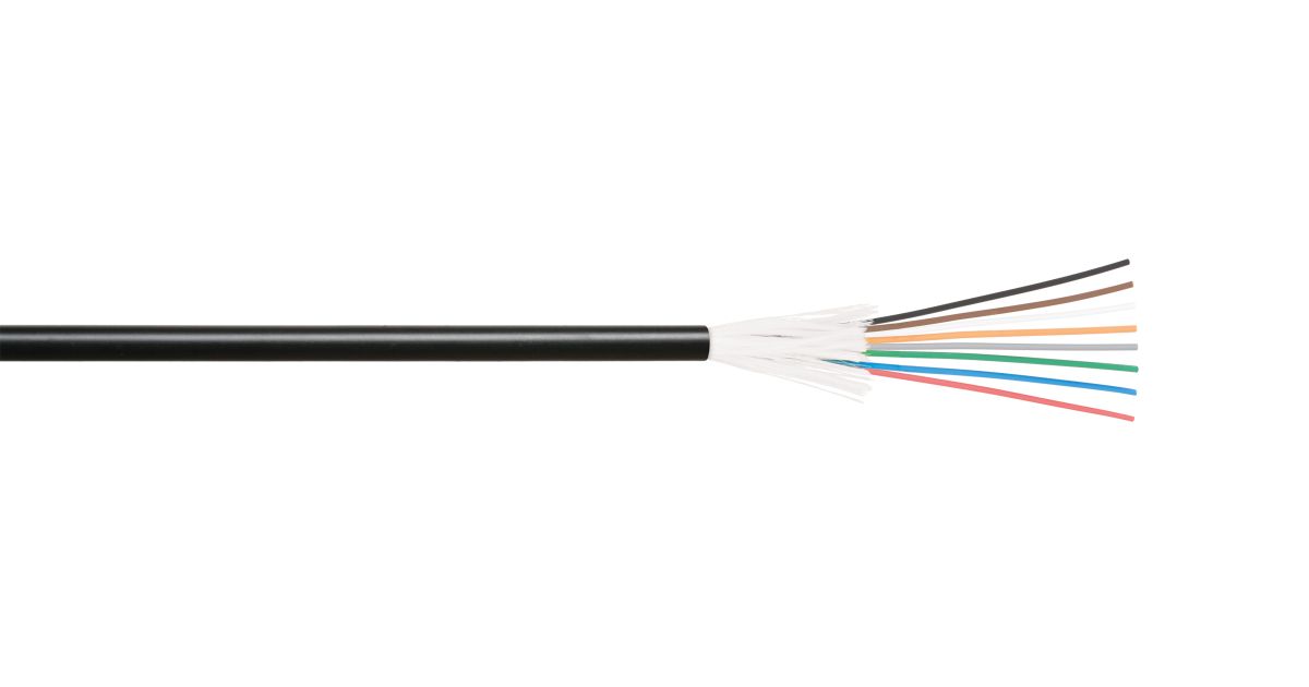 Кабель волоконно-оптический, 8 волокон, многомодовый 50/125мкм, стандарта OM4, полимерный материал нг(A)-HF, внутренний/внешний, распределительный, с плотным буфером, силовой элемент стеклонити, черный, 0.44 кН, -40 до +70 °C.