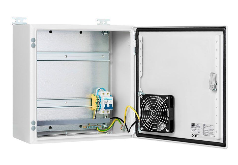 Шкаф монтажный всепогодный из листовой стали с порошковым покрытием, в комплекте: гермовводы, проходные клеммы, двухполюсный автомат, шина заземления, вентилятор с термостатом, AC 100...240 В; IP66, -40...+60°C, 400х400х210 мм.