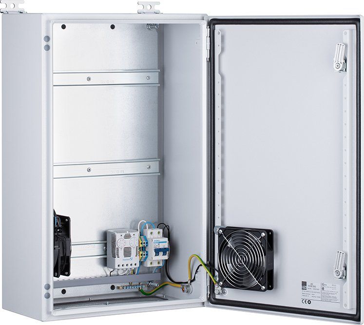 Шкаф монтажный всепогодный из листовой стали с порошковым покрытием, в комплекте: гермовводы, проходные клеммы, двухполюсный автомат, шина заземления, вентилятор и нагреватель с термостатом; AC 100...240 В; IP66, -40...+60°C, 380х600х210 мм.