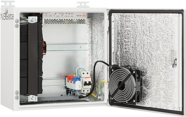Всепогодный бесперебойный блок питания: комплект настенного крепления, монтажную панель, с DIN-рейку, проходные клеммы, двухполюсный автомат, шину заземления, вентилятор с термостатом, согласованный с заказчиком комплект кабельных вводов и систему бесперебойного питания DC 48В, 155ВA с крепежом для АКБ 7Aч x4,IP66, -40 ~ +50°C, Защита батареи от глубокого разряда и КЗ, 380х380х210 мм. Поставляются без установленных АКБ.