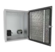Шкаф монтажный всепогодный из армированного стекловолокном полиэстера, с монтажной панелью с DIN-рейками для клиентского оборудования, комплект [1,2] (с вентилятором и нагревателем); U-пит.100...240В, P-потр.100 Вт; IP66, t-раб.-40...+60°С, 400x400x200 мм. В комплекте гермовводы, проходные клеммы, двухполюсный автомат (10 А), шина заземления, вентилятор с термостатом, нагреватель с термостатом.