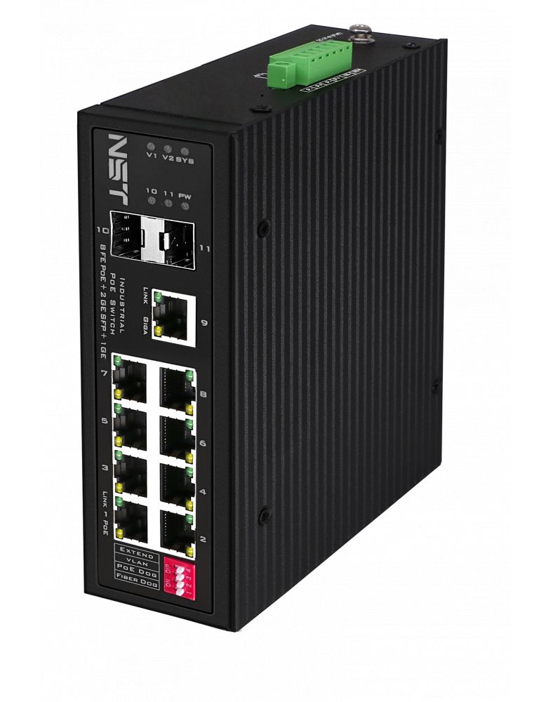 Промышленный HiPoE коммутатор сетевой 11 портовый с РоЕ гигабитный; 8хRJ45 PoE 10/100 Мбит/с с PoE, 1-2 порт с PoE до 90Вт, A+B IEEE 802.3bt, 3-8 порт до 30Вт IEEE 802.3af/at, 2хSFP Uplink 1000 Мбит/с, 1хRJ45 Uplink 10/100/1000 Мбит/с; PoE бюджет до 360 Вт; поддержка PоE Watchdog и Extended PoE до 250 метров; питание: 2x входа DC37-57В, БП в комплект НЕ входит; монтаж на DIN-рейку или на стену (крепление в комплекте), грозозащита 6кВ; -40... +80°C; 50х187х130 мм.