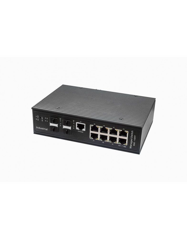 Промышленный коммутатор гигабитный 12 портовый управляемый L2+, 8xRJ45 10/100/1000Мбит/с, 4хSFP Uplink 1000 Мбит/с; монтаж на DIN-рейку или на стену (крепление в комплекте), встроенная система мониторинга температуры/напряжения + внешний датчик температуры/влажности; выходы типа "Сухой контакт", цифровой вход; поддержка режима CCTV: увеличение расстояния передачи данных до 250м, грозозащита 6кВ, питание: 2xвхода DC12-57В(15Вт) БП в комплект НЕ входит; -40…+80°С, 50х187х130мм.