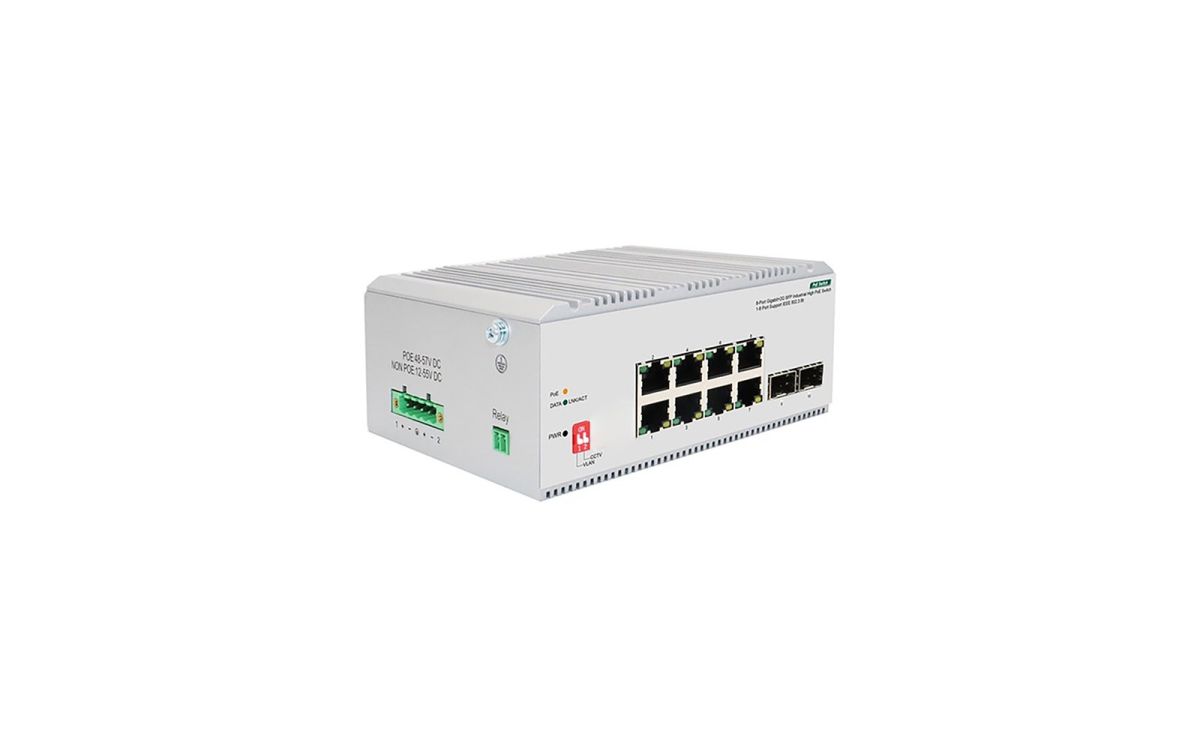 Коммутатор сетевой гигабитный неуправляемый 10 портовый с РоЕ промышленный; 8xRJ45 PoE 10/100/1000 Мбит/с, IEEE 802.33 af/at/bt, до 90 Вт на порт; 2xSFP Uplink 1000 Мбит/с; PoE бюджет до 185 Вт; дальность PoE до 250 м, поддержка VLAN; монтаж на DIN-рейку, резервируемые входы питания 48-57 В DC, 188 Вт, БП в комплект НЕ входит; грозозащита до 6 кВ, -40... +75°C; 145х109х62 мм.